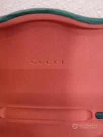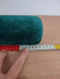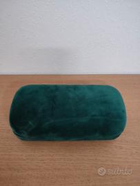 portaocchiali rigido in velluto verde petrolio all'esterno e rosa all'interno. Come nuovo