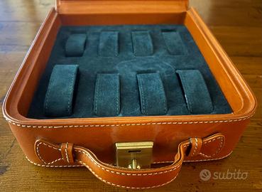 Portaorologi in cuoio con interno in velluto verde. Puó contenere 8 orologi. Dimensioni: cm24xcm22. Usato poche volte, e’ in ottime condizioni , presenta solo leggeri segni di usura