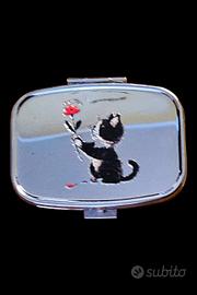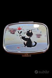 Scatola per pillole quadrata con motivo floreale di gatto, 2 scomparti portatili per contenere pillole, graziosa miniscatola di metallo, scatola portatile per gioiellil e pile, regalo creativo personalizzato con logo a motivo cartoni animati, adatta per viaggi, ttività all'aperto, borse, tasche. Misure scatola: 5,5 x 4 cm
