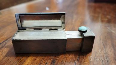 Portarossetto vintage in argento 800 con finiture incise. Il coperchio si apre e vi è il vano per un piccolo specchietto. Decorato con una pietra incastonata. In perfetto stato di conservazione.