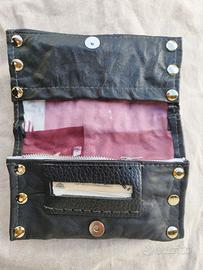 Portatabacco dallo stile glamour, realizzato con ritagli di pelle nera e zebrata e decorato con borchie dorate.