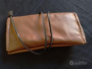 Come vedete dalle foto, al di sopra di questa tasca, c'è il porta cartine, mentre nella parte superiore del portatabacco, la pelle ripiegata serve a tenere aperto il pacchetto di tabacco.