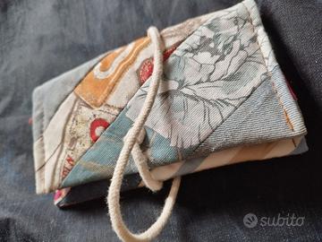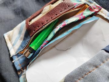 Portatabacco upcycling, realizzato in denim e tessuti riciclati.