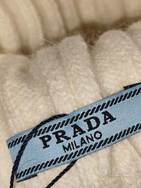 Cappello Prada in maglia spessa color panna con morbido pompon sulla sommità. Dettaglio logo triangolare frontale che aggiunge un tocco luxury al design caldo e accogliente.