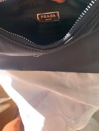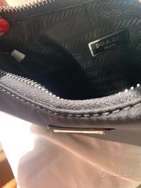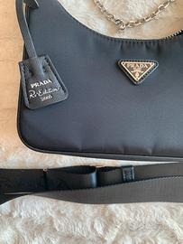 Prada,borsa re-edition 2005 nel color nero.Manico in catena removibile,dotata di tracolla regolabile in nastro logato.Necessaire rimovibile con chiusura a zip e portachiavi.Logo Prada sul triangolo in metallo smaltato sulla parte anteriore e sul necessaire.Chiusura con zip ed interno siglato Prada.