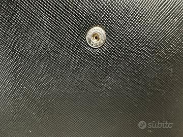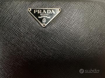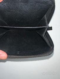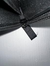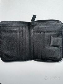 Portafoglio Prada nero in pelle saffiano con chiusura zip-around e logo triangolare in metallo sul davanti. Interno con diversi scomparti per carte, vano per banconote e tasca con zip centrale. Molto pratico e compatto, ideale da usare tutti i giorni. Presenta normali segni di utilizzo visibili nelle foto, soprattutto sugli angoli e all’interno, ma resta in buone condizioni generali. Colore: nero Materiale: pelle saffiano Misure circa: 11 x 10 cm