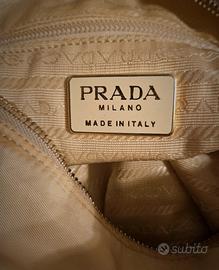 PRADA, second hand in perfetto stato.Realizzata a spalla con banoliere in pelle inserita nelle catene dorate.Ritroviamo metallo, antiruggine,dorato per i quattro piccoli oblo',sui quali e'inciso il logo,dai quali poter regalere la lunghezza delle bandoliere.Tote bag in nylon color champagne, logo ICONICO, ,posto al centro della parte anteriore della borsa. L'apertura e'superore con zip,centrale.L'interno fodera nella nuance di un delicato oro con logo a contrasto tra il lucido ed opaco.All'interno una comoda tasca con zip sulla quale trionfa il triangolo PRADA