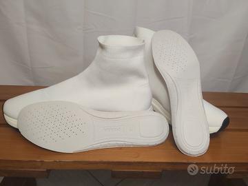Prada Knit High-Top Sneakers, taglia 10,5 da conversione su Google corrisponde ad una 44 Come nuove e ancora con etichette sotto la suola. Nessun difetto, rottura, imperfezione o altro. Notare la perfezione della suola e la totale mancanza di usura e i codici all'interno della scatpa Modello con design in maglia elasticizzata senza lacci. Modello: Sneakers alte a calzino. Materiale: Realizzate principalmente in tessuto a maglia high-tech (spesso una maglia stretch o Re-Nylon), con suola in gomma. Design: Presentano un design minimalista, senza lacci, con il logo "Prada" lettering tipicamente impresso sul lato o sulla soletta. Stile: Offrono un look sportivo ma sofisticato, che ricorda le silhouette delle scarpe da basket vintage o da corsa contemporanee. Seguiteci sullo pagina ufficiale Instagram: endasecondskin