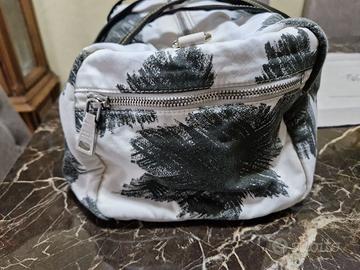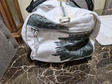 Bauletto bianco con disegni verdi, manico e profili verdi in pelle.