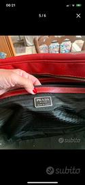 Prada originale borsa business. Pelle martellata rosso scuro con interno in seta con logo Prada. Tasche interne chiuse con zip e portapenne. Parti metalliche argentate. Misure 30x45x10 cm