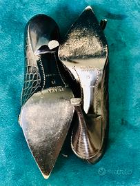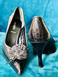 Prada décolleté in crocodile-print leather, according to the trends of the season, with refined application. Extremely elegant. Leather upper and leather interior lining.