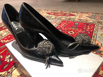 Décolleté firmate Prada, in pelle a stampa cocco, come vogliono i trend di stagione, con ricercata applicazione. Estremamente eleganti. Tomaia in pelle e rivestimento interno in pelle.