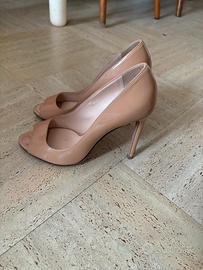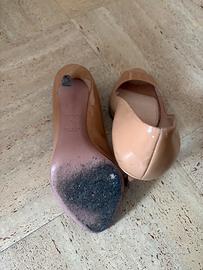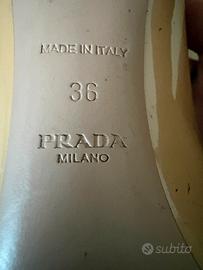 Décolleté eleganti color nude in vernice, modello open toe, firmate Prada. Scarpe raffinate e versatili, perfette sia per occasioni eleganti che per outfit più casual chic. Condizioni: buone, con leggeri segni di utilizzo visibili (come da foto), soprattutto sulla soletta interna. Tacco medio, comodo da indossare anche per diverse ore. Taglia: 36 Un classico intramontabile, facile da abbinare!