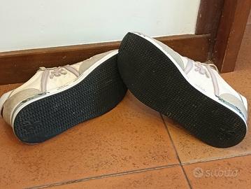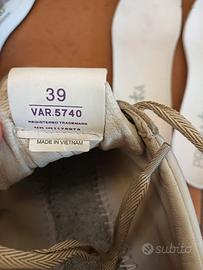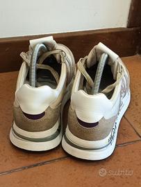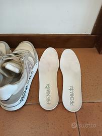 SNEAKERS PREMIATA – MODELLO BETH (VAR. 5740) – TAGLIA 39 Vendo bellissime sneakers Premiata originali, modello Beth, caratterizzate dall'iconica suola platform decorata e dal design ricercato "Made in Vietnam" (come da etichetta interna). Caratteristiche principali: Marca: Premiata Modello: Beth (VAR. 5740) Taglia: 39 Colore: Toni neutri (beige/panna/grigio chiaro) con dettagli rosa cipria e inserto viola sul tallone. Materiali: Mix di camoscio (suede) e tessuto tecnico di alta qualità. Interno in morbida pelle. Dettagli: Suola platform logata con le iconiche scritte del brand ("483 Original", "White Air Force"). Condizioni dell'articolo: Le scarpe sono usate ma ben tenute come visibile dalle foto. La tomaia è pulita e ben conservata. Le suole presentano una lievissima e normale usura da utilizzo, ma il battistrada è ancora perfetto. Interni integri e loghi sulla soletta ben visibili.