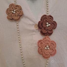Una collana davvero delicata e romantica🌸che combina due elementi classici e senza tempo, le perle simbolo di eleganza e raffinatezza e i fiori all’uncinetto che aggiungono un tocco artigianale, caldo e femminile.I toni del rosa cipria e malva creano un contrasto morbido con il bianco delle perle, rendendola perfetta per uno stile:romantico vintage,shabby chic ✨ Ideale da abbinare con camicie leggere in lino o cotone,abiti fluidi primaverili look semplici da valorizzare con un accessorio protagonista😍😍