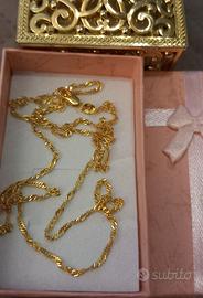 Deliziosa e preziosa catenina, lunghezza 60cm,leggerissima ed elegante, caratterizzata da una particolare lavorazione a "onda d'acqua" che crea bellissimi riflessi di luce ad ogni movimento.L'articolo è realizzato in metallo testurizzato con placcatura di alta qualità Gold Filled Oro 18K:una tecnica che garantisce una durata e una brillantezza superiori rispetto alla classica placcatura sottile.
