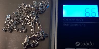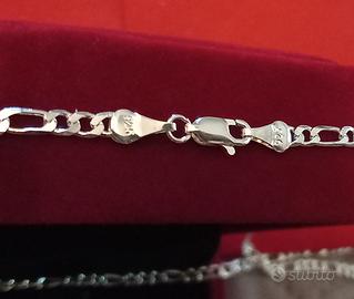 Vendo preziosa collana girocollo in ARGENTO925 autentico (presente il punzone che ne certifica la purezza)a maglia piatta, larghezza mm 2,5. Il gioiello presenta una raffinata lavorazione artigianale che riflette molto bene la luce.Mai usato.Lunghezza: 50 cm.Peso: 6,6 grammi