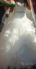 Abito sposa pronovias con scollo a cuore in piume. Vita leggermente bassa.