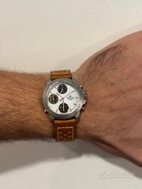 Cassa in acciaio satinato con lunetta girevole, quadrante bianco con contatori neri (stile panda), indici applicati e lancetta cronografica centrale rossa.