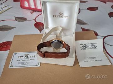 Vendo ad euro 350, orologio PRYNGEPS-CRONO inizio anni 80, SWISS MADE ORIGINALE, COME NUOVO, cassa laminata in oro 24 k, STAINLESS STEEL BACK ref. 1521, carica manuale, macchinario di alta qualità, così come da foto, scatola,garanzia, provenienza, il tutto dell’epoca.