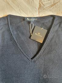 Pullover in lana a maglia rasata con scollo a V, nel classico colore blu navy. Qualità eccellente.