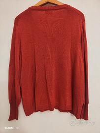 pullover color arancio e oro marca "Canda " 87% in viscosa TG. L scollo a V polsini lunghi. Molto elegante per via del tessuto ma anche del colore che è un arancio forte punteggiato in oro. Leggero si può indossare da solo o come sottogiacca. Utilizzato 2 sole volte come nuovo.