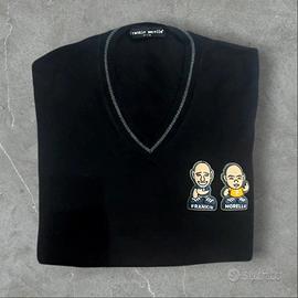 Raro pezzo d'archivio Frankie Morello (Gilmar) in 100% Lana Vergine. Maglione nero con scollo a V, dettagli grigi e iconica patch cartoon dei designer sul petto. Estetica Y2K / 2000s originale, qualità Made in Italy superiore. Capo in condizioni perfette (10/10), senza difetti.