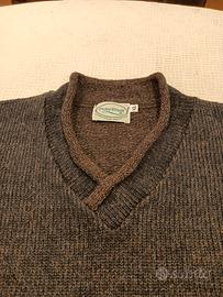 Bellissimo maglione vintage firmato Peter Elliott (Sportswear Collection), caratterizzato da uno stile classico e senza tempo. Il capo presenta un particolare collo a V incrociato con un inserto a contrasto marrone chiaro che dona un tocco raffinato e originale.