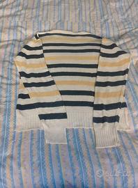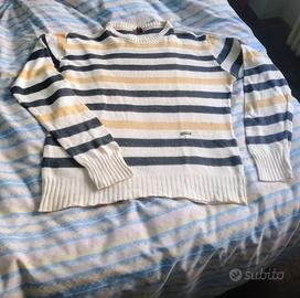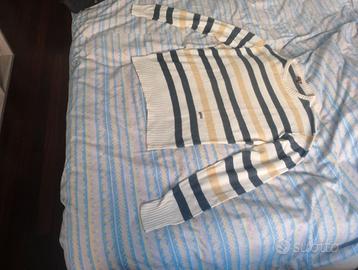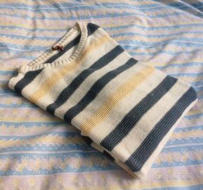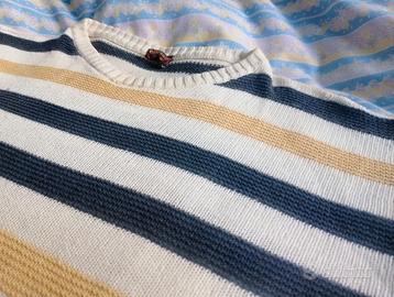 Bellissima maglia a maniche lunghe in 100% puro cotone leggero brand Oviesse. Caratterizzata da una raffinata lavorazione a micro-costine che rende il tessuto elastico, morbido e molto traspirante. - Pari Nuovo per inutilizzo, la trama è in stato impeccabile, senza nessun segno d'usura. - Design a righe orizzontali panna, blu navy e giallo ocra. Ideale per le mezze stagioni ed estate - - Stile casual-nautico moderno Misure precise (prese in piano): Spalle: 51 cm Torace (Ascella-Ascella): 60 cm Manica: 66 cm Lunghezza Totale: 62 cm Vestibilità: Taglia XL italiana (54/56). - Taglio regolare e confortevole, perfetto da indossare sopra un jeans. Grazie alla lavorazione a costine, il tessuto accompagna bene le forme senza stringere. La lunghezza delle maniche (66 cm) la rende perfetta anche per persone di statura medio-alta. - RITIRO a BOLZANO (Gries) o Spedizione Veloce-Tracciata con TuttoSubito e la protezione acquirente, perfettamente imballato.