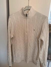 Pullover ORIGINALE TOMMY HILFIGER in pura lana a maglia intrecciata, con mezza zip e collo a lupetto; con collo, polsini e fondo a coste