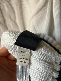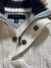 Pullover intrecciato in puro cotone da uomo a collo alto, con abbottonatura a zip e bottone automatico. Dettagli blu navy sui polsini e sull’orlo. TG: XL Composizione: 100% Cotone Per altre info contattatemi in privato!