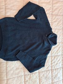 Vendo questo maglione firmato OVS color blu scuro/navy. È un modello molto versatile con un particolare collo a scialle (incrociato sul davanti) e una trama a costine verticali che lo rende elastico e confortevole.