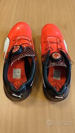 La scarpa è la versione dotata del sistema DISC, la celebre tecnologia Puma senza lacci. Quella specifica colorazione (rosso acceso con dettagli neri a nido d'ape e banda bianca).