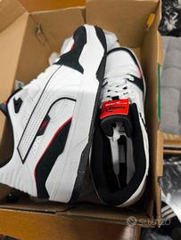 Scarpe Puma sneaker modello Slipstream BBall Jr . Realizzate in pelle di colore bianco, con inserti di colore nero e dettagli in rosso. Fondo in gomma di colore bianco e nero. Interno foderato in tessuto, fusbet estraibile. Chiusura con lacci di colore bianco. Altezza tacco 3,0 cm. Prodotto originale.