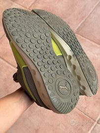 Vendo anche queste scarpe da ginnastica di un elegantissimo e non troppo marziale grigio verde con dettagli fluo. Dopo averle usate per la palestra ci ho fatto la stagione al mare (ma quanti lavori ho fatto?? Troppi), poi finita la stagione le ho usate per andare a correre. Hanno conosciuto ogni tipo di sporcizia, praticamente gli ho fatto fare per tanti chilometri molte delle cose peggiori che si possono far fare a un paio di scarpe. Con dentro i miei piedini. Su consiglio del sito le avevo comprate 40.5 eur, cioè un numero e mezzo sopra il mio, infatti la particolarità di queste scarpe è che si stanno sfondando in cima! Il mio alluce vuole uscire 🤪 per il resto sono consumate come tutte le mie scarpe, si vede anche dalle suole… le solette si stanno staccando, un casino. Però i lacci non sono inclusi.