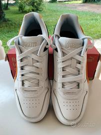 Scarpe da ginnastica/sneakers unisex Puma modello Rbd game Low, scarpe da ragazzi/bambini, serie Junior ma utilizzabili anche da adulti; in ottime condizioni tg 39 cm 25. Utilizzate pochissime volte per cambio numero, non hanno difetti se non qualche piccolissima pieghetta laterale visibili in foto su una delle scarpe dovuta alla morbidezza della pelle. Soletta interna morbidissima e comoda, esterno in pelle e materiale sintetico, suola in gomma. Modello colore White black Zinnia Gold; completi di scatola originale. Disponibile ritiro a mano ad Avigliana e dintorni o spedizione a carico dell'acquirente