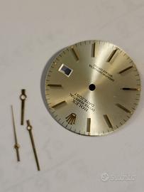 Quadrante per Rolex Oyster perpetual Datejust calibro 3035 - referenza 16030. Argento con indici oro. Comprensivo di set 3 lancette oro. Perfetto. Piedini a posto. Vedi foto. Smontato da orologio di mia proprietà. 100% autentico. 240 euro o proposta di acquisto.