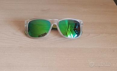 Quechua Occhiali da sole rettangolari. La montatura è di colore grigio trasparente e le lenti Verdi a specchio. Usati poco, sono in ottime condizioni.