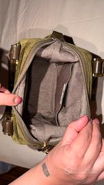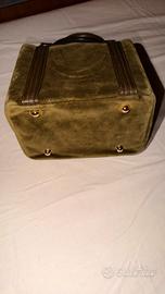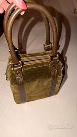 Marca: Rada (Borse Made in Italy) Modello: Handbag a bauletto vintage Materiale: Velluto e Pelle Colore: Verde Oliva / Verde Bosco e nero Dettagli del Design Elegante borsa a mano firmata Rada, un marchio storico dell'artigianato italiano. corpo della borsa è realizzato in un lussuoso velluto verde oliva, caratterizzato da una bellissima lucentezza cangiante. I profili, i doppi manici e le fasce verticali sono in vera pelle nera con cuciture a contrasto che ne sottolineano la struttura geometrica. Caratteristiche Principali • Hardware: Dettagli in metallo dorato lucido, inclusi i piedini protettivi sulla base e gli attacchi dei manici. - Chiusura: Zip superiore con un particolare lucchetto decorativo dorato che funge da tirazip. • Interno: Foderato in tessuto tecnico operato (effetto nido d'ape) molto resistente, con etichetta originale "Rada Borse - Made in Italy". Dispone di una tasca interna aperta. • Base: Fondo rigido dotato di 4 piedini metallici per proteggere il velluto dall'usura.