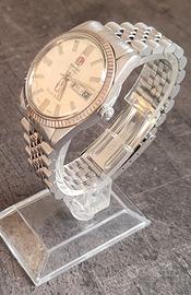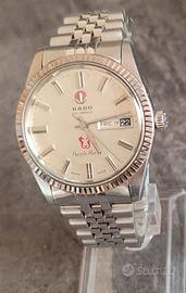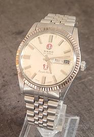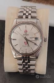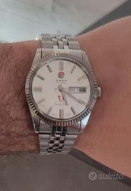 Diametro cassa 36.5mm esclusa corona, ghiera zigrinata, quadrante argentè, corona originale rado