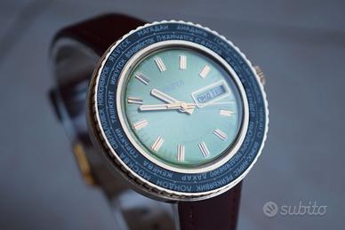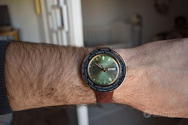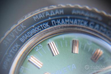 Affascinante orologio vintage Raketa di produzione sovietica, caratterizzato da un elegante quadrante verde con finitura soleil che riflette la luce in modo dinamico, impreziosito da indici applicati color oro e lancette coordinate; la presenza della ghiera girevole con le principali città del mondo in caratteri cirillici richiama la tipica funzione “world time”, elemento distintivo di questi modelli prodotti in epoca URSS, mentre il datario con giorno della settimana anch’esso in cirillico aggiunge ulteriore fascino e autenticità; la cassa placcata oro, dal generoso diametro di 42 mm, si presenta in ottime condizioni generali, ben conservata e con segni del tempo contenuti e coerenti con l’età dell’orologio, così come il quadrante che mantiene una resa estetica molto gradevole e uniforme, il tutto completato da un cinturino generico non originale ma perfettamente utilizzabile; sul fondello è inciso il logo CCCP con relativo numero di serie, elemento sempre meno frequente da riscontrare su esemplari di questo tipo; l’orologio è funzionante e mantiene bene il tempo, risultando quindi non solo un oggetto da collezione ma anche indossabile quotidianamente, ed è equipaggiato con movimento meccanico a carica manuale di manifattura Raketa calibro 2628H; importante: trattandosi di un pezzo della mia collezione privata, la vendita è da intendersi tra privati.