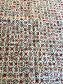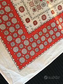 in bianco rosso e nero, stampa a fiorellini stilizzati e bordo rosso