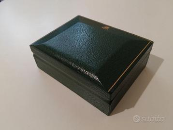 ROLEX Scatola vintage anni 60/70 Rara Pre-referenza "Trapezio" Adatta e coeva per GMT-Master 1675 ma anche per Submariner 5512 5513 ed altri dell'epoca In pelle verde con logo e finiture dorate Interno in legno con logo in verde "Création Genève" Inserto portaorologio in stoffa verde di nuova produzione e non dell'epoca Condizioni splendide con lievissimi segni di uso e del tempo Chiude perfettamente Le foto sono parte integrante della descrizione Misura: cm. 13 x 10,5 x 5 circa Autentica ROLEX garantita