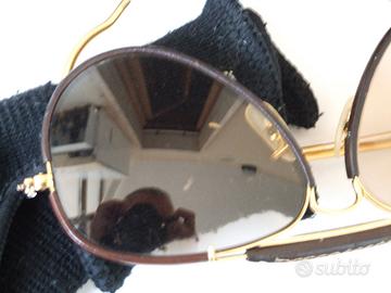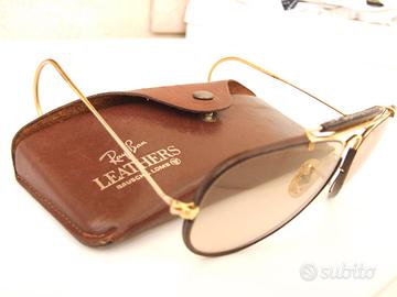 Bellissimi e raffinatissimi Ray-Ban Aviator Leathers, completamente rivestiti in pelle come da foto, con lenti Bausch&Lomb (marchiate BL) fotocromatiche, dalle eccezionali doti ottiche e di durezza, ed astuccio in pelle. Tutto rigorosamente originale anni ’80 (a parte un’invisibile vitarella) ed in ottimo stato.