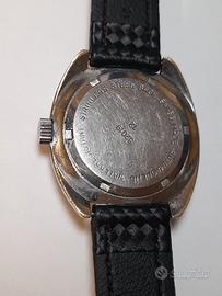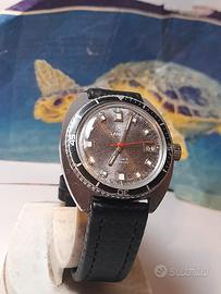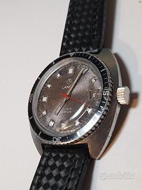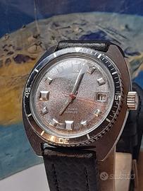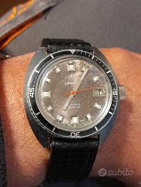 Davvero molto bello, skin diver Anni 70 Della famosa Casa lanco, la cassa cromata a cuscino misura 37 mm per 42mm Con esclusione della corona con chiusura a pressione la cromatura è ancora. Bella sui lati e nella parte anteriore mentre Nella parte posteriore forse perché a contatto con dei braccialetti si presenta un po usurata. Davvero stupendo il quadrante grigio marmorizzato Con grandi indici applicati la la ghiera e di tipo bidirezionale L ' orologio è mosso da un movimento manuale pulito E perfettamente funzionante ( ha uno scarto di 8 secondi in 24 ore , completa l ' orologio un Bel cinturino in pelle Con stampa3 d. ASTENERSI PERDITEMPO !
