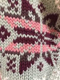 Questo maglione presenta una splendida lavorazione in stile Fair Isle, con un affascinante motivo geometrico che mescola tonalità di verde menta, rosa antico, bordeaux e un tocco di bianco. Il filato di alta qualità garantisce morbidezza e comfort, rendendolo ideale per le mezze stagioni o per le serate più fresche.