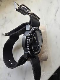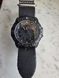 dalla mia collezione personale, "cambio progetto" molto bello luminescente trizio, cinturino in pelle stile militare quadrate nero con numeri in rilevo, in carbon, batteria nuova, completo di scatola, originale.. Movimento ETA LUMINOX originale nuovo.