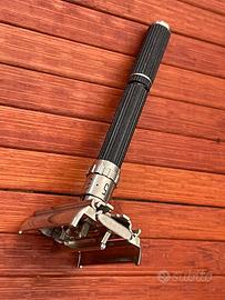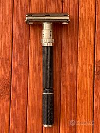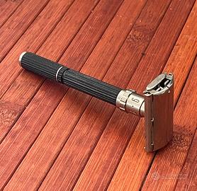Rasoio di sicurezza vintage Gillette Super Adjustable 109 prodotto negli Stati Uniti, forse risalente all’anno 1973 o 1975. È conosciuto anche con il soprannome di "Black Beauty" per via del manico nero. È un rasoio regolabile, con una ghiera che permette di modificare l'aggressività della rasatura. Dispone di un meccanismo sistema "TTO" (Twist-to-Open) per facilitare l'inserimento della lametta e di una ghiera numerata (solitamente da 1 a 9) per regolare l'aggressività del taglio. Materiali: Testina in metallo cromato e manico in metallo con finitura nera. Prodotto negli Stati Uniti, spesso ricercato dai collezionisti per la sua qualità costruttiva. La produzione di questo modello è avvenuta tra il 1968 e il 1988. Misura di lunghezza 107 mm Misura di larghezza testina 41 mm.