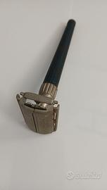 rasoio di sicurezza da collezione Gillette Slim Twist vintage degli anni '60, caratterizzato da un manico in plastica blu e una torsione in metallo per aprire il rasoio.