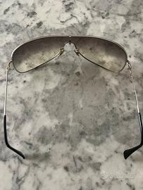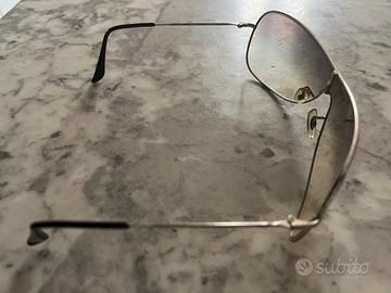 Ray-Ban anni 90 a mascherina. Ottima montatura qualche graffietto nelle lenti da sole grigio scuro sfumato che non compromette l’utilizzo. Privo di costodia ma posso fornirne un’altra di Moschino.
